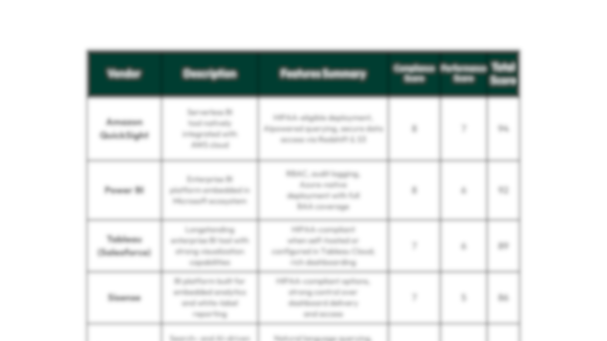 To help teams select the right downstream BI platform, we’ve translated the evaluation rubric into a scorecard that reflects both compliance strength and insight delivery potential. This table summarizes how each downstream BI platform performs across privacy, governance, reporting functionality, and healthcare usability dimensions.